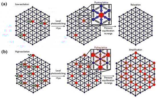 The elastic contributions resulting from LS to HS state switching can possibly be enhanced by exploiting intermolecular cooperativity to improve the photo switching efficiency of the LS to HS state transition []. The fraction of molecules photo-switched to the HS state linearly depends on the energy density used and is limited to one molecule per photon (as noted above), whereas the elastic step is shown to exhibit a nonlinear relation with laser power (Figure 9b). The nonlinear response indicates that there is a threshold excitation energy density where there is a HS fraction increment triggered by a amplification process []. The cooperative mechanism by which this light induced phenomena acts through nearest neighbors is schematically illustrated in Figure 10 []. When the excitation energy density is low (Figure 10a), the fraction of photo-switched HS molecules is limited to a linear response dependence. The molecules to be photo-switched to the HS state need a larger volume within a lattice. For a lattice with most molecules in the LS state, a molecule in the HS state is subjected to local elastic forces pushing HS spin state complex back to the previous LS equilibrium state. When the excitation energy density is large enough (Figure 10b) photo-induced HS state fraction increases sufficiently and exerts pressure on the lattice causing a lattice expansion []. This expansion favors the HS phase which then grows from nucleation sites and in turn increases the HS state fraction further. This self-amplification process, due to intermolecular cooperative phenomenon, can therefore enhance the photo switching efficiency, with reported values of more than 5 molecules per incident photon [].