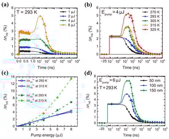 (a) The high spin state molecular fraction of a 100 nm [Fe(HB(tz)3)2] thin film with respect to the time delay, for different excitation energies. (b) At constant excitation energy, the time evolution of the high spin fraction of 100 nm thick thin film for different temperatures. (c) The comparison of high spin fraction formed due to photo-switching and thermal step at two different temperatures with respect to the pump energy. (d) The photo-response of a thin film of [Fe(HB(tz)3)2] to a excitation energy of 6 µJ, although of a different film thickness. Reprinted with permission from Ref. []. Copyright 2019 John Wiley and Sons.