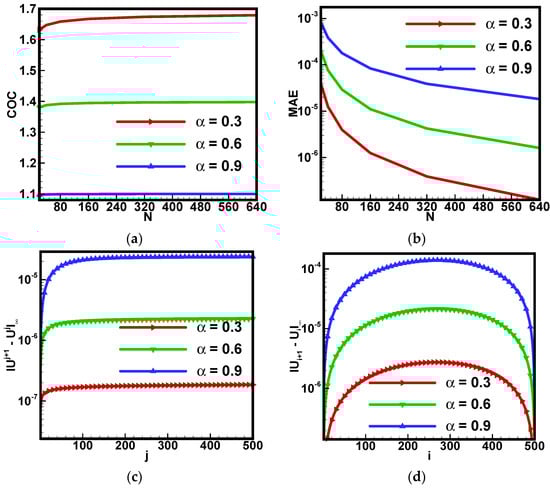 The convergence of the applied scheme is observed against the selection of each fractional-order derivative, and its convergence order enhances for . Figure 2c,d contains the L∞-norm between consecutive solutions that is and when 0 ≤ i, j ≤ N, M = 500. Again, it is found that the proposed scheme is very efficient, accurate and reliable for this problem. It also demonstrates that the solution is stable against the selection of fractional order and mesh parameters.