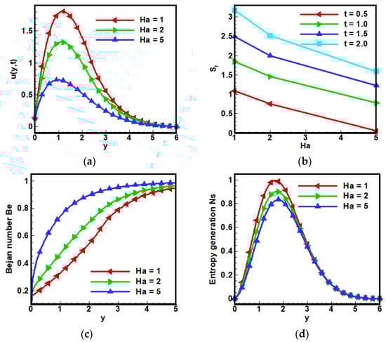 Figure 3 shows the effect of the magnetic field parameter on the velocity profile of fractional Maxwell fluids. It can be seen that velocity decreased by increasing the value of because of the Lorentz’s force. The rise in caused strengthening in the Lorentz force, which increases the internal resistance to flow particles; consequently, fluid velocity decreased. Whereas an increase in Skin friction occurs, as shown in Figure 3b. Since Bejan number is the ratio of total entropy generation to entropy generation due to heat transfer. Thus, advancement in boosts the Bejan number-BN and can be noticed in Figure 3c. An opposite behavior of total entropy generation relative to Bejan number—BN appears against the increasing value of , as can be seen in Figure 3d.
