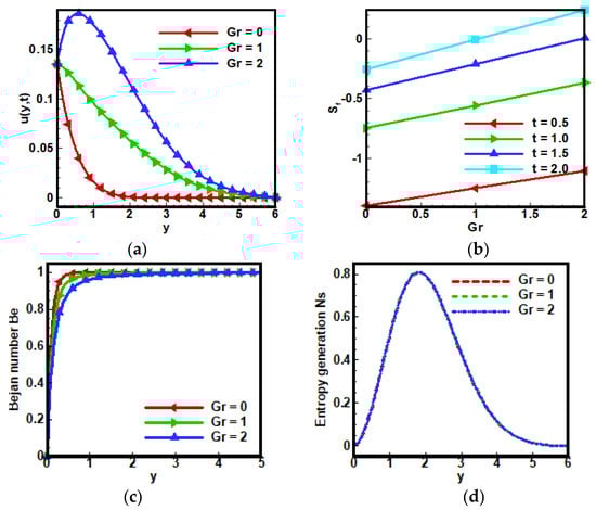 Figure 4 depicts the effects of the Grashof number on velocity profile . The enhancement in value of results in increasing the fluid velocity, which can be physically justified as the increasing value of means lower the viscous forces and hence increasing the velocity of fractional Maxwell fluids. While Skin friction increases, the increasing the value of can be noticed in Figure 4b. A slight effect of on Bejan number—BN and entropy generation can be seen in Figure 4c,d, respectively. Similar results are reported by Sarojamma, G., et al. in [61] for comparison. is the ratio of buoyancy forces to viscous force, increasing value of results in laminar boundary layer and vice versa. Because high value of give rise to the temperature of molecules, consequently, the intermolecular forces become weak. Thus, velocity profile also rises. On the other hand, fluid particles collectively gain momentum as increases, so additional heat is lost nearby, that is why skin friction reduces as shown in Figure 4b. Since Bejan number is ratio of entropy generation due to heat to the total entropy generation of the system, that is why reduces the value of Bejan number—BN deliberated in Figure 4c.