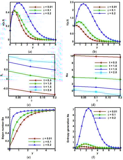Figure 5 shows the effects of the volume fraction parameter on fluid velocity, and it is examined that advancement in controlled volume fraction parameter lowers the velocity profile due to the effect; that is, the viscosity of fractional Maxwell fluids increases by increasing . On the other hand, the addition of nanoparticles in the base fluid causes an improvement in the heat transfer rate at the boundary layer. As the thermal conductivity of base fluid is enhanced, consequently increasing the fluid’s internal temperature can be seen in Figure 5b. Since Nusselt number is the ratio of convective heat transfer to conductive heat transfer, increasing has a decreasing relation with Nusselt number . This is because the skin friction decreases with the passage of time against the volume fraction parameter . These results for skin friction and Nusselt number are viewed in Figure 5c,d, respectively. An increasing trend is noticed for the Bejan number and can be seen in Figure 5e as the heat transfer rate becoming better by increasing . Whereas in Figure 4f entropy generation enhanced by increasing the value of . Because the viscosity of fluid increased by increasing .
