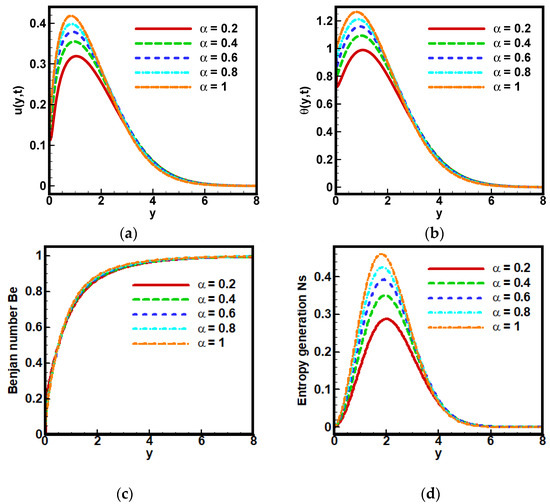 The reason is that the gradual increase in fractional parameter gives rise to the viscosity of the nanofluid. This means intermolecular forces between the nanoparticles and base-fluid particles increase; consequently, Brownian motion of particles reduces, that is, a decrease in velocity profile occurs. The consequences of fractional order parameter for velocity profile are inverse as depicted in Figure 6a. On the other hand, have direct relation for , as shown in Figure 6b. Figure 6c shows that for an increasing value of the entropy generation decreases, whereas a rise in varies directly, deliberated in Figure 6d.
