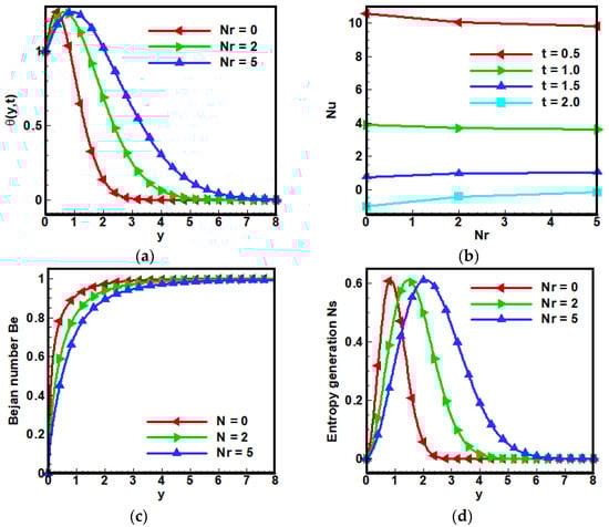Figure 7 shows the effects of thermal radiation parameter on temperature of the fluid. Applying thermal radiations gives rise to the temperature of particles of nanofluids. Hence, the particles’ kinetic energy increases, and the rate of collision between the particles of the nanofluids becomes high, which is why a rising increase in temperature profile occurs. Therefore it is concluded that increasing the value of causes an increase in fluid temperature. is the ratio of convective to conductive heat transfer across the boundary, but enhancement in conduction occurs with the addition of nanoparticle therefore, a decrease occurs in , depicted in Figure 7a,b, respectively. A decrease in Bejan number—BN can be noticed in Figure 7c, whereas entropy decreases initially and then increases gradually, as can be seen in Figure 7d. Similar results are reported in [61].
