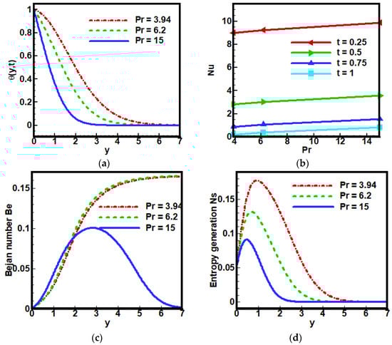 Prandtl number is the dimensionless number and is the ratio of momentum to thermal diffusivity. It is a fluid property but does not have any dependence on flow type. Thus, an increase in means heat transfer is favored to occur by momentum, not conduction. This parameter controls the relative thickness and thermal boundary layer in heat transfer problems. Lowering the value of means the heat diffuses spontaneously as compared to momentum, which thickens the thermal boundary layer rather than the momentum boundary layer. Therefore, an increase in decreases the temperature profile of fractional Maxwell fluids as expressed in Figure 8a, which expectedly decreases the Nusselt number . Since Bejan number has an inverse relation with entropy generation , due to heat transfer, that is, decreases with the increase in value of as illustrated in Figure 8.