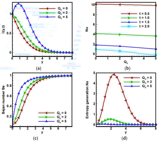 Figure 9 shows the effects of the heat source term on temperature profile , since heat source gives rise to temperature profile as shown in Figure 9a, but with the passage of time, it is noticed that the Nusselt number decrease is dependent inversely on the conduction of heat. Thus, entropy generation expectedly decreases as shown in Figure 9d. This phenomenon gives rise to the Bejan number because entropy generation due to heat transfer has an inverse relation with the Bejan number , as shown in Figure 9c.