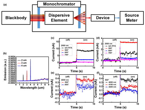 (a) Measurement setup with monochromator. (b) Spectroscopic results for the 2, 3, and 4 µm monochromator settings. (c–f) Current variation over time of each thermal annealing parameter device under 2 µm, 3 µm, and 4 µm. (f) After annealing at 500 °C, the behaviors of the device under 4, 4.1, and 4.2 µm light irradiation.