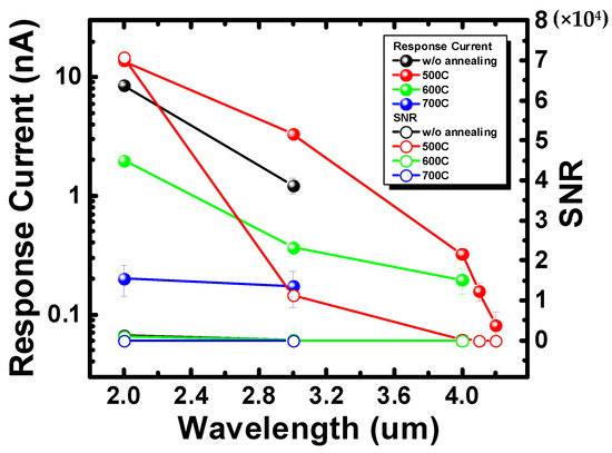 The monochromator can select narrow band wavelengths from a broadband light source and the chopper controls the illumination and non-illumination measurement conditions of the Schottky device (Figure 2a). The spectra (Figure 2b) show the spectroscopic results for the 2, 3, and 4 µm monochromator settings. The current of device under dark conditions is termed the dark current, and the current of an illuminated device is the light current. The response current is the difference between the light and dark currents. Figure 2c–e show the current variation over time of each device illuminated by 2, 3, and 4 µm light. All of the devices with different parameters were able to detect 2–3 µm signals, but the signal amplitudes were different under the same measurement conditions. The device annealed at 500 °C had the best signal performance, followed by the device without annealing, the device annealed at 600 °C, and the device annealed at 700 °C. Moreover, in Figure 2f, we carefully measured the detection limit of the device after annealing at 500 °C. We found that the spectral detection capability of the device after annealing at 500 °C had an improvement of 1.1–1.2 µm compared with the device without annealing.