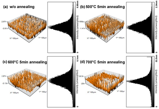 Atomic force microscope images of the surface: (a) without annealing; (b) after annealing at 500 °C for 5 min; (c) after annealing at 600 °C for 5 min; (d) after annealing at 700 °C for 5 min.