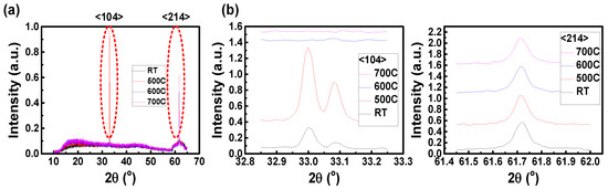 (a) The XRD measurements of the film without annealing, after annealing at 500 °C for 5 min, after annealing at 600 °C for 5 min, and after annealing at 700 °C for 5 min; (b) the XRD peak at the <104> and <214> crystal plane.