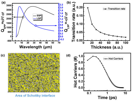 (a) Relationship between plasmon resonance quality factor and wavelength at Cr surface; (b) relationship between hot carrier transition rate and thickness; (c) schematic diagram of effective surface area; (d) decay of hot carrier number with time.