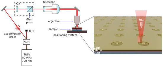 Hybrid NPs are obtained from gold/silicon bi-layer films using an experimental setup (Figure 1) based on a commercial femtosecond laser system (femtosecond oscillator TiF-100F, Avesta Poject (Troitsk, Moscow, Russia ) emitting at central wavelength 790 ± 5 nm with a pulse duration of 100 fs at the repetition rate () of 80 MHz. Laser radiation is turned on and off by an acousto-optic modulator (AOM) and goes through a motorized attenuator (dashed rectangle in Figure 1). Laser pulses were tightly focused by a microscope objective (Olympus 40×, NA = 0.75), resulting in the estimated FWHM diameter of beam of d = 1.3 m in a focal plane. The average laser power () was controlled by a power meter (FieldMax II, Coherent, Santa Clara, CA, USA). Pulse energy (E) can be calculated as and the laser fluence (F) is . The samples are placed on a 3D positioning system (air-bearing translating stage driven by brush-less servomotors (ABL1000, Aerotech, Pittsburgh, PA, USA) and exposed during scanning along the circle trajectory at a speed of 5 m/s. Preliminary experiments were made to find processing conditions (fluence and size of scanning area) providing single NP formation for films of various thicknesses: for 10/100 nm Au/Si film—10 mJ/cm and 0.79 m, for 30/180 nm—12 mJ/cm and 3.14 µm, and for 30/90 nm—14 mJ/cm and 3.14 µm.