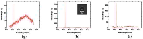 According to our results, NPs fabricated from the bi-layer film of Au (30 nm)/Si (180 nm) thickness demonstrate the strongest PL signal among considered films, as it appears both from PL signal mapping (Figure 2g–i) and PL measurements of single hybrid NPs (Figure 4a–c). It is generally accepted [,] that broadband emission in hybrid nanostructures composed of silicon coupled to a plasmonic part essentially comes from the silicon part through multiphoton absorption, while hot electrons and holes generated in gold could be injected into silicon through tunnel action, providing the enhancement of PL efficiency. Therefore, one can assume that this result comes from the highest amount of silicon.