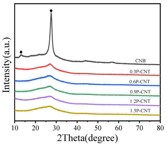 The XRD patterns of the CNB, 0.3P-CNT, 0.6P-CNT, 0.9P-CNT, 1.2P-CNT, and 1.5P-CNT samples.