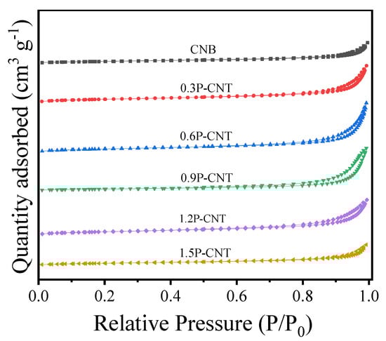 N2 adsorption-desorption curves of the CNB, 0.3P-CNT, 0.6P-CNT, 0.9P-CNT, 1.2P-CNT, and 1.5P-CNT samples.