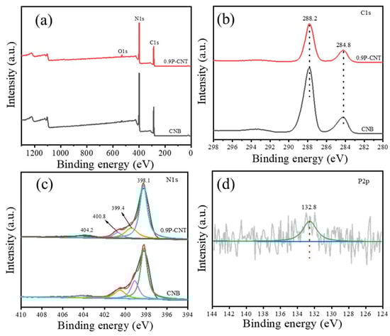X-ray photoelectric spectroscopy (XPS) was employed to further investigate the surface elemental composition and chemical status of the P bonded with the other elements. Figure 6a demonstrates the XPS survey spectra, in which peaks belonging to the C, N, and O elements could be observed in the XPS survey spectrum of the 0.9P-CNT sample. The signal of the O element originated from the oxygen adsorbed in the air, however, the absence of the P element detected in the survey spectrum may be due to its low content. To further investigate the interaction of the P element with CNT, the high-resolution XPS tests were performed and the results are displayed in Figure 6b–d. In the C 1s spectrum (Figure 6b) of the 0.9P-CNT sample, two significantly dominant peaks could be found at 284.8 and 288.2 eV, corresponding to the adventitious carbon and the sp2-hybridized carbon containing defects (-N=C-N), respectively [,,]. The N 1s spectrum (Figure 6c) of the 0.9P-CNT sample can be subdivided into four smaller peaks with binding energies of 398.1, 399.4, 400.8, and 404.2 eV [,]. The major N 1s peak at 398.1 eV originated from the sp2-hybridized nitrogen atom in the triazine rings (C=N-C), while the peak at 399.4 eV was associated with the N-(C)3 group or the amino group ((C)2-N-H) in the sp3-hybridization. A weak peak at 400.8 eV corresponded to the N-(C)3 groups or a residual amino functional group in the aromatic cycle. In addition, there was an ignorable peak at 404.2 eV from the π excitation [,]. The feeble peak at 132.8 eV in Figure 6d was derived from the P–N bond [,], further indicating the presence of the P element in the 0.9P-CNT sample. On this basis, the XPS analysis results also strongly demonstrate that P successfully substituted C and formed the P–N bond in the 0.9P-CNT sample, leading to the formation of crystal defects, which would exert a positive effect in separating the photogenerated electron–hole pairs.