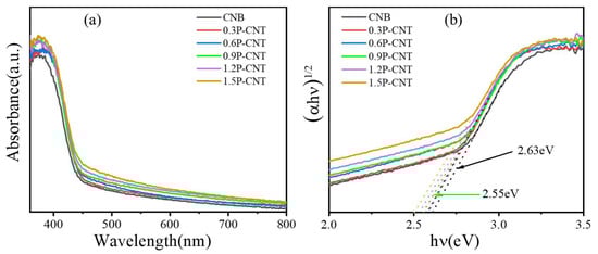 The UV–Vis diffuse reflectance spectra (a) and corresponding Tauc plot (b) of the CNB, 0.3P-CNT, 0.6P-CNT, 0.9P-CNT, 1.2P-CNT, and 1.5P-CNT samples.