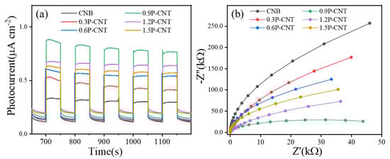 The photocurrent (a) and electrochemical impedance spectra (b) of the CNB, 0.3P-CNT, 0.6P-CNT, 0.9P-CNT, 1.2P-CNT, and 1.5P-CNT samples.