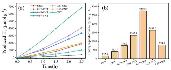 An energy band structure suitable for photocatalytic hydrogen production makes the P modified materials promising visible photocatalysts. The photocatalytic property was assessed by detecting the produced hydrogen under the illumination of a Xenon lamp source (λ > 420 nm). Figure 9a shows the photocatalytic hydrogen production performance of the samples, from which it could be observed that the hydrogen production of the CNB and CNT was very low. The HPR of the CNB sample was only 157.3 μmol g−1 h−1, which stemmed from its narrow visible-light response range and fast-photogenerated carrier complexation rate [,]. The morphological modulation from the CNB to CNT (413.7 μmol g−1 h−1) increased the HPR, which illustrates that the tubular structure can improve the photocatalytic performance, but such a slight improvement is far from the desired goal. Excitingly, the HPR of all of the P-doped samples was higher than the CNB sample. With the increase in the P-source input, the HPR of P-CNT increased. When the P-source input reached 0.9 wt%, the 0.9P-CNT photocatalyst showed the highest HPR of 2749.3 μmol g−1 h−1, which was 17.5 and 6.6 times higher than the CNB and CNT samples, respectively. However, the HPR of the P-CNT gradually declined when the amount of P was further increased, indicating that too much element doping does not further enhance the catalytic performance, but causes negative effects. Furthermore, the 0.9P-CNT sample showed a better photocatalytic performance for the decomposition of aquatic hydrogen compared with most of the photocatalysts reported in the previous literature (Table 2).
