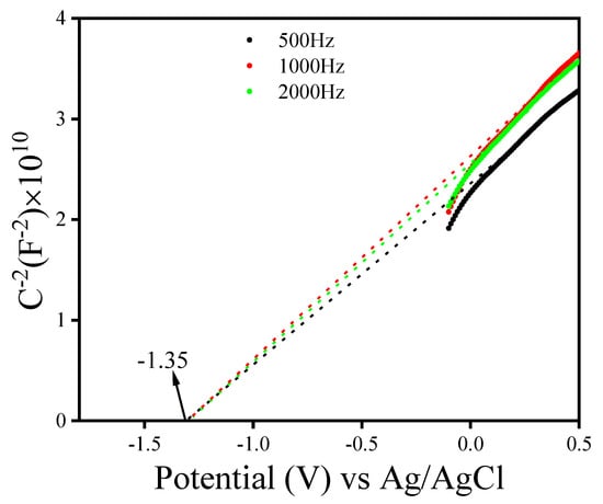 The energy band structure of the 0.9P-CNT sample was studied using the Mott–Schottky (M–S) plot to ensure the band edge potential and semiconductor nature. As shown in Figure 10, the M–S plot of the 0.9P-CNT sample exhibited a positive slope, indicating a typical n-type semiconductor []. In addition, the flat band (fb) potential of the 0.9P-CNT sample was estimated to be −1.35 V vs. Ag/AgCl. Subsequently, its Efb (NHE) was determined using the Eq. Efb (NHE) = Efb (Ag/AgCl) + (0.059 × pH) + E(AgCl), where the pH of the Na2SO4 electrolyte was 6.8 and E(AgCl) was 0.198 V at 25 °C. Usually the ECBM = Efb (NHE) −0.2 V for n-type semiconductors, therefore, the ECBM of 0.9P-CNT was evaluated to be −0.95 V. Based on the Eg value of the Tauc plot with ECBM, the EVBM was estimated to be 1.6 V. Such a negative band can enable the 0.9P-CNT sample to achieve photocatalytic hydrogen production and become a promising hydrogen production photocatalyst.