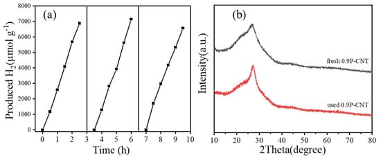 The performance stability is very significant for the commercial use of photocatalysts, so the 0.9P-CNT sample was used for the cyclic hydrogen production test under the same conditions and the experimental results are shown in Figure 11a. After three cycles of hydrogen production tests, the amount of produced hydrogen slightly decreased. In addition, the fresh and used 0.9P-CNT samples were characterized by XRD, and the results (Figure 11b) showed that the crystal structure of the 0.9P-CNT sample remained intact after the cyclic tests, indicating that the 0.9P-CNT photocatalyst possessed excellent photostability.