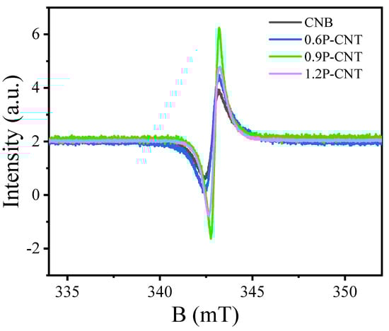 Room temperature EPR signals for the CNB, 0.6P-CNT, 0.9P-CNT, and 1.2P-CNT samples.