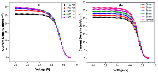 (a) Current-density comparison as absorber layer thickness varies; and (b) current-density comparison as HTM layer thickness varies.