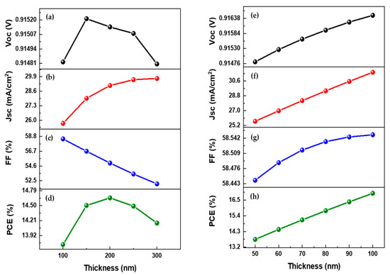 (a,e) Voc as a function of active layer and HTM layer thickness; (b,f) Jsc as a function of active layer and HTM layer thickness; (c,g) FF as a function of active layer and HTM layer thickness; and (d,h) PCE as a function of the active layer and HTM layer thickness.