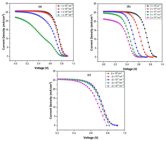 (a) Current-density comparison at various defect densities of the absorber layer; (b) current-density comparison at various defect densities of IL1; and (c) current-density comparison at various defect densities of IL2.