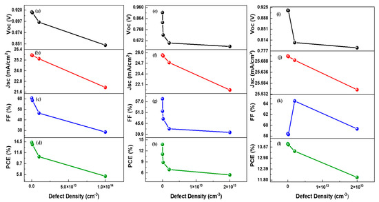 In this simulation, active layer defects (traps) are varied from 1 × 1011 cm−3 to 1 × 1014 cm−3 to analyze their effects on the device performance. The deviation in output parameters with variation in the trap density of the absorber layer is shown in Figure 5a and Figure 6a–d. It is observed that, with the rise in trap density, the output parameters of OSC fall dramatically. The PCE drops significantly from 14.30 to 5.35%, and Jsc drops from 25.75 to 22.13 mA/cm2. A surge in defect density leads to a decline in a carrier lifetime, which ultimately reduces the generation rate and promotes recombination.