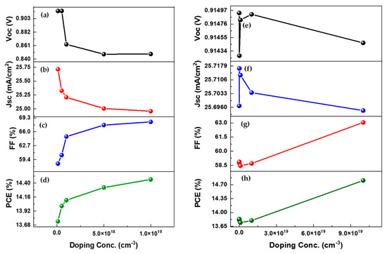 (a,e) Voc as a function of active layer and HTM layer doping density; (a,e) Jsc as a function of active layer and HTM layer doping density; (b,f) FF as a function of active layer and HTM layer doping density; (c,g) PCE as a function of active layer and HTM layer doping density; and (d,h) PCE as a function of active layer and HTM layer doping density.
