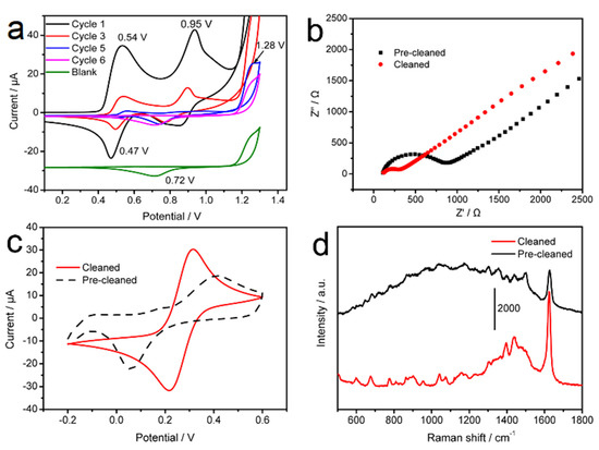 (a) CV curves of electrochemical cleaning of GCA electrodes, (b) EIS, (c) CV curves of [Fe(CN)6]3−/4−, (d) SERS spectra of MB on the GCA substrate before and after the cleaning process.