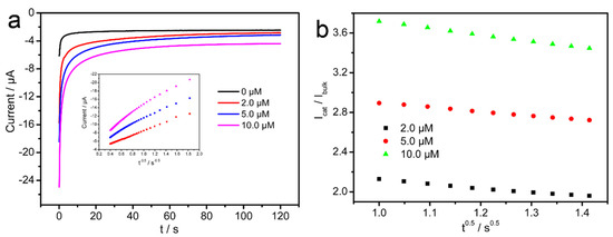 Next, we investigated the performance of detecting glucose by chronoamperometry. To perform these detections, different concentrations of glucose (0, 2.0, 5.0, and 10.0 μmol/L) were reacted with glucose oxidase in advance. The PQT@GCA electrode was then introduced to the electrolyte, the potential was set as 0.2 V, and the time–current curves were collected. As shown in Figure 6a, the steady-state current is achieved within 10 s, indicating a shorter response time as a glucose sensor. The diffusion coefficient (D) for H2O2 can be obtained according to the Cottrell Equation (2) [44].