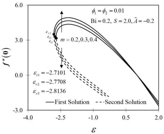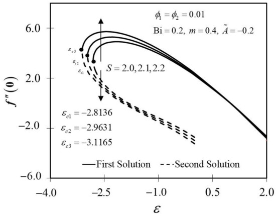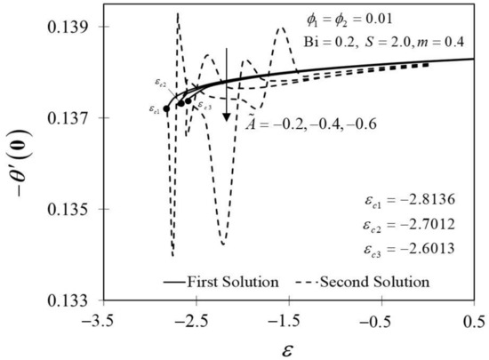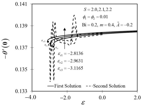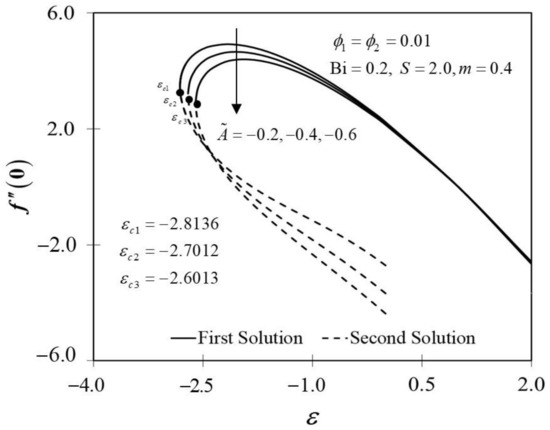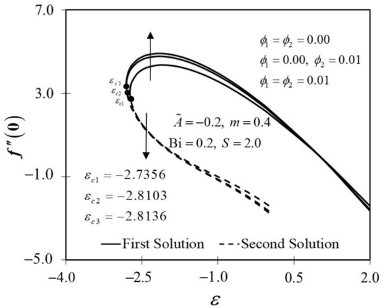 The significance of on and against are depicted in Figure 6 and Figure 7. It is spotted that as increases, and are plotted to be increased in the first solution. Similar results are observed in Waini et al. [35]. This appears to result in an increase of approximately in heat transfer rate as increased. Thus, higher values of are proven to contribute to the working fluid’s thermal efficiency. In addition, Figure 6 also shows that when the wedge surface moves at a rate of , . This explains the appearance of no frictional drag force on the progressed wedge surface, which is heated convectively. Furthermore, this study is also interested in examining the effect of the unsteadiness parameter, in hybrid nanofluid flow, which plays the role of heat transfer fluid, influencing mechanical behavior by observing how the coefficient of skin friction and heat transfer rate change. Figure 8 shows that the decrement of triggered to diminish in the first solution, and the reaction was in the opposite direction towards the second solution. While decreases, a reduction in the velocity gradient is observed, therefore diminishing. Subsequently, when is reduced, the obtained results of display a reduction trend in both solutions, as shown in Figure 9. This observation supports the idea that decreasing the unsteadiness strength lowers the heat transfer efficiency.