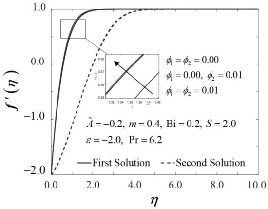 Figure 2 and Figure 3 display the trend of and against with several which represent several types of fluids, including viscous fluid , alumina/water nanofluid , and copper–alumina/water hybrid nanofluid . As noted in Figure 2, the first solution tends to increase as increases, while the alternative solution displays an opposite behavior. Clearly, we can see that expands as the volume fraction of nanoparticles, , increases from a viscous fluid to a hybrid nanofluid in the first solution. When 1% and 2% of the total volume fraction of alumina is injected, the skin friction coefficient of the hybrid nanofluid and nanofluid is higher than the viscous fluid. The combination of nanoparticle volume concentration increased the working fluid’s viscosity; hence, the fluid velocity was boosted. The same characteristic is observed in Figure 3, which exposed the improvement in heat transfer rate towards the first solution as progresses. As a result, our findings support the notion that an increased concentration of nanoparticles in the working fluid helps to improve cooling efficiency as the viscous fluid transforms into a hybrid nanofluid. These findings are similar to the results obtained by Sarkar et al. [16]. According to their study, the synergistic effect in the nanoparticle can improve the heat transfer performance of a hybrid nanofluid. This has resulted in a heat transfer rate improvement with the addition of nanoparticle volume fractions. The impacts of on dimensionless and are shown in Figure 4 and Figure 5, respectively. The addition of accelerates fluid velocity as the wedge travels parallel to the free stream, as shown in Figure 4. Hence, it causes the fluid viscosity to decrease, developing the dimensionless velocity profile . On the other hand, Figure 5 depicts the nanoparticle volume fraction effect on the temperature profile with assorted values of The temperature distribution profile exhibits a downward trend in both solutions as inclines. Therefore, we can conclude that the inclusion of in hybrid nanofluids leads to a decrease in the boundary layer thickness; thus, the temperature distribution in the flow region declines as intensifies.
