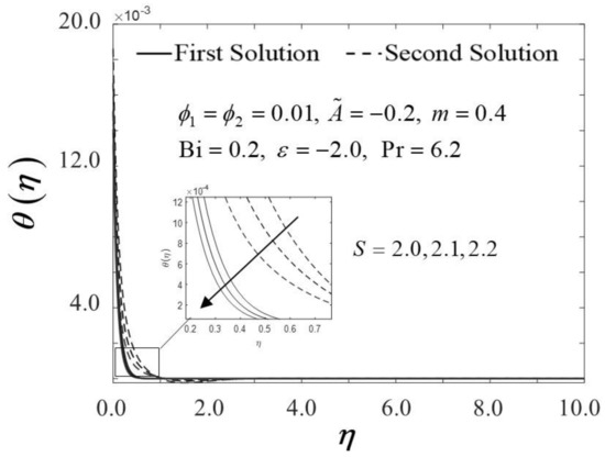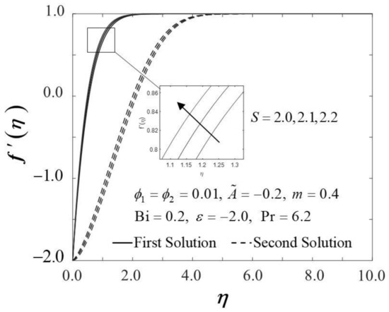 The consequence of the suction parameter with is presented in Figure 10 and Figure 11. Figure 10 emphasizes that as escalates, amplifies in the first solution of the hybrid nanofluid but not in the second solution. In addition, in this observation, the rising values of expanded the dual solution domain and caused an increment in the critical value on the moving wedge of the hybrid nanofluid. This finding also contributes to the delay of the boundary layer separation process as improves (see Figure 12). Additionally, the skin friction coefficient results recorded the highest level with the largest value of in the hybrid nanofluid flow. Meanwhile, Figure 11 shows the value of increases with increasing value of on the moving wedge surface in both solutions. This occurrence is caused by the increment of suction values, allowing the flow of hybrid nanofluid to approach the wedge surface, thus reducing the thickness of the thermal boundary layer (see Figure 13). As a result, the hybrid nanofluid flow travels at a high velocity, enhancing the shear stress and thus intensifying the thermal performance. In connection with the results discussed earlier in Figure 10 and Figure 11, Figure 12 depicts the influence of suction parameter on velocity profile , while Figure 13 shows the temperature field distributions via implementing dual-type nanoparticles. The velocity profile inclines as the number of suction increases due to increased fluid viscosity. However, the presence of such particles tends to lower the temperature profile. This is due to a rise in the thermal conductivity of the mixing fluid, which improves heat transfer performance.