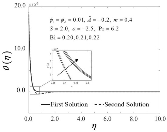The Biot number (Bi) is described as the ratio of conduction to convection times. Since the small magnitude of Bi reduces the effect on high thermal regions, the range of Bi in this study is selected in between . Physically, enhancing the values of Bi, raises the temperature inside the boundary layer; however, it also creates a higher density thermal boundary layer and is effectively responsible for regulating the temperature within the thermal reactors. Figure 14 and Figure 15 show the result of various Bi on and thermal boundary layers , respectively. The improvement in is proven in Figure 14 as Bi increases towards the moving wedge, which significantly increases the rate of heat transfer with a similar value of critical point, i.e., . As predicted, higher surface temperatures arise from stronger convection, thus, enabling the thermal resistance to permeate deeper, as shown in Figure 15. The results are similar to those of Hussain et al. [33], who found that increasing the value of Bi for convective heat transfer improves the thermal boundary layer thickness.
