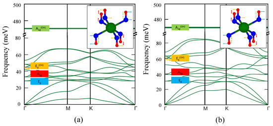 However, the E and A modes represent the reciprocating vibration of O and H atoms, implying that the O-H bond distance varies. In both compounds, the O-H stretching [50,76] at high frequency mode with energy 470 meV appears in the phonon spectrum. Inspecting the displacement vectors of this high-frequency mode ( meV), we see that it is associated with out-of-plane displacement of the hydrogen and oxygen atoms.