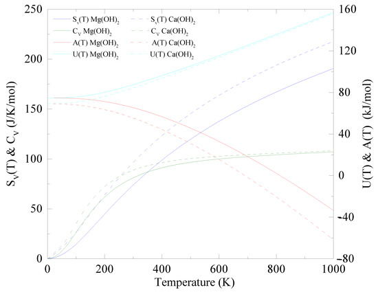 Experimental results show that bulk Ca(OH) is more reactive than Mg(OH) when exposed to carbon dioxide () and this likely remains true in monolayers [77,78]. We observe that of monolayer Ca(OH) at around room temperature is slightly higher than that of monolayer Mg(OH), indicating a greater change in the internal energy in a wide range of temperatures.
