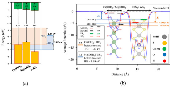 As depicted, the electron affinity(), is the difference between the vacuum level and the Fermi level (vacuum level is shifted to zero). The electron affinity of Ca(OH)/HfS and Mg(OH)/WS obtained from HSE06 are calculated to be 3.12 and 3.00 eV, respectively. We also include the band edges of each M(OH) and TMD compare with Anderson’s rule [79,80] for heterostructures.