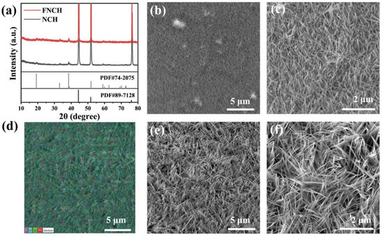 Characterization of phase and morphology. (a) XRD pattern of FNCH and NCH; (b,c) SEM images of NCH; (d) SEM EDX mapping of FNCH; (e,f) SEM images of FNCH.