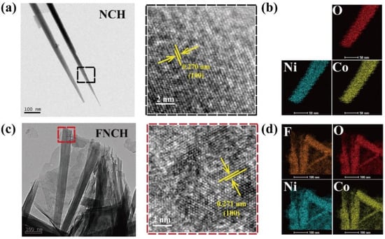 Transmission electron microscopy (TEM) is applied to further study the 1D nanowire structure of NCH and the unique structure of FNCH. The array unit of NCH and FNCH are detached from the Ni foam by ultrasonication, and their TEM and HRTEM images are shown in Figure 2a,c, respectively. Single nanowire with a diameter of 20~30 nm can be observed in NCH and the 0.270 nm lattice fringe is indexed to the (100) plane of nickel hydroxide (Figure 2a), consistent with the results of XRD and SEM. FNCH displays a similar interplanar distance of 0.271 nm with NCH, corresponding well to the XRD result. The array unit of FNCH exhibits a hierarchical structure where the nanowires staggered to form a 2D flake-like unit. Combining the TEM and SEM images, FNCH demonstrates a unique structure of nanoarray with a vertically aligned hierarchical unit on Ni foam, which may shorten the diffusion path of the electrolyte ion. The TEM energy dispersive X-ray spectroscopy (EDX) mapping result reveals that NCH and FNCH have an even element distribution on their array unit, but the F element only appears in FNCH while Ni, Co and O elements exist in both NCH and FNCH, suggesting the uniform doping of the F element (Figure 2b,d).