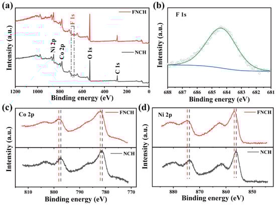 X-ray photoelectron spectroscopy (XPS) measurement is conducted to acknowledge the chemical states of surface elements. From the XPS survey spectra, the F element can be only observed in FNCH, while the characteristic peaks of Ni, Co and O exist in both FNCH and NCH. Figure 3b shows the high-resolution spectra of F 1s, the peak located at 684.31 eV is attributed to the F–metal bonding, which confirms the doping of the F element [25]. Figure 3c,d compared the high-resolution spectra between FNCH and NCH. Both Ni 2p and Co 2p peaks in the spectra of FNCH shift slightly towards a higher binding energy compared to NCH, due to the incorporation of the F element [26]. The high electronegativity provides the F element with a strong electron-withdrawing ability, and thus improves the electron binding energy [27,28]. Obviously, F doping is achieved successfully through a facile hydrothermal synthesis and plays a momentous role in composition adjustment and morphology control.
