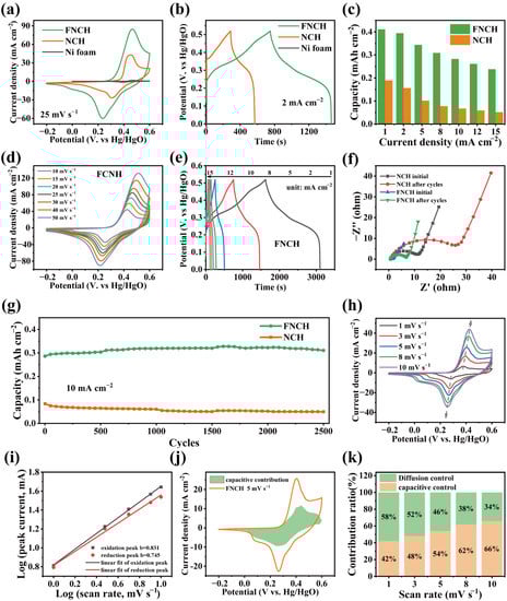 Electrochemical performance tests of FNCH and NCH materials. CV curves (a) and GCD curves (b) comparisons of FNCH and NCH; (c) capacity at various current of FNCH and NCH; (d) CV curves and (e) GCD curves of FNCH under different conditions; (f) Nyquist plot of FNCH and NCH before and after cycles. (g) Cycling performance of FNCH and NCH; (h) CV curves of FNCH for b value fitting; (i) b value fitting result; (j) CV curves of origin data and fitting data at 5 mV s−1. (k) Contribution ratio at different scan rates.