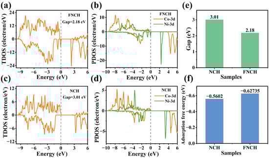 TDOS of FNCH (a) and NCH (c); PDOS of Ni-3d and Co-3d of FNCH (b) and NCH (d); (e) gap values of FNCH and NCH; (f) OH− adsorption energy of FNCH and NCH.