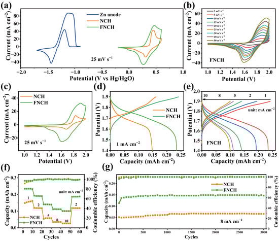 Based on the above study, aqueous Zn batteries are assembled using NCH or FNCH as the cathode electrode and Zn plate as the anode electrode with a 3M KOH electrolyte in a two-electrode system. The CV curve of the Zn anode shows a typical battery-like shape as well as FNCH and NCH (Figure 6a) and the low redox potential can provide a high working voltage for the Zn battery to achieve a high energy density [41,42]. The CV curves of the FNCH–Zn and NCH-Zn battery at various scan rates are shown in Figure 6b and Figure S6a, and the battery presents a similar shape without obvious distortion when scan rate increases from 2 to 50 mV s−1, suggesting low polarization and fast charge transfer. The CV curve comparison of the FNCH–Zn battery and NCH–Zn battery at 25 mV s−1 are illustrated in Figure 6c; the FNCH–Zn battery exhibits a larger CV area than the NCH–Zn battery, indicating a better electrochemical performance. As revealed in Figure 6d, the FNCH–Zn battery delivers a capacity of 0.23 mAh cm−2 at 1 mA cm−2, which is much higher than the NCH–Zn battery (0.15 mAh cm−2). As the current density increased to 10 mA cm−2, the FNCH–Zn battery still maintains a high capacity of 0.1 mAh cm−2, while the capacity of the NCH–Zn battery is below 0.05 mAh cm−2 (Figure 6e and Figure S6b). Both the FNCH–Zn and NCH–Zn batteries exhibit a good rate capability when discharged at various current densities, but the capacity of the FNCH–Zn battery is always higher (Figure 6f). From the cycling performance of the batteries in Figure 6g, the FNCH–Zn battery delivers a higher capacity than the NCH battery without any decay after 3000 cycles, revealing exceedingly excellent cycling stability. Consequently, FNCH shows better electrochemical performance when applied in aqueous Zn batteries. With the high capacity and outstanding cycling stability, the modified FNCH material is proved to be a potential cathode for high performance AZBs.