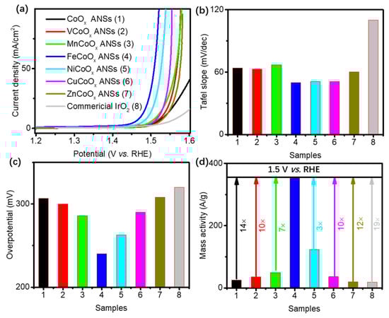 Electrochemical characterization of MCoOx ANSs. Polarization curves (a), specific Tafel slopes (b), specific overpotential of achieving 10 mA/cm2 (c), and specific mass activity at 1.5 V vs. RHE (d) of Co-based ANSs. Fe1Co1Ox ANSs show highest OER activity among these Co-based ANSs.