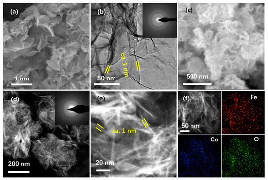 The structural characterizations focus on the Fe1Co1Ox ANSs because Fe1Co1Ox ANSs show the best OER activity (Figure 1). As shown in Figure 2, we use SEM and transmission electron microscopy (TEM) method to character ANSs. SEM and TEM images show that CoOx ANSs have well-defined 2D structures (Figure 2a,b). The selected area electron diffraction (SAED) pattern, inset in Figure 2b, certifies the amorphous feature of CoOx ANSs again. Figure 2b shows that CoOx ANSs possess a thickness of ca. 1 nm. The SEM and low magnification high angle annular dark field (HAADF) images (Figure 2c,d) show the hierarchical nanostructure of Fe1Co1Ox ANSs, with a width of ca. 400 nm. A high-resolution HAADF image verifies the Fe1Co1Ox ANSs thickness of ca. 1 nm, as shown in Figure 2e. EDS mapping shows the homogeneous distribution of Fe, Co, and O (Figure 2f). The ultrathin Co-based ANSs formation can be attributed to the surfactant of CTAB (with a high concentration of 0.05 M) and NaOH (with fast precipitation rate in solution, formation of amorphous MCoOx ANSs) [41]. The concentration of CTAB is above 2-fold its second micelle concentration (0.021 M) [42], leading to the CTAB micelles in reaction solution tending to form two layer structures (Scheme 1). The ultrathin layer structure and elemental homogeneous distribution of Fe1Co1Ox ANSs may be caused by the fast nuclei of Fe and Co in alkaline solution during the coprecipitation process. This growth mechanism also works in synthesizing NiOx ANSs (Figures S8 and S9).