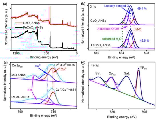 XPS spectrum of CoOx ANSs and Fe1Co1Ox ANSs. Survey spectrum (a), O 1s spectrum (b), Co 2p spectrum of CoOx ANSs and FeCoOx ANSs (c), and Fe 2p spectrum of FeCoOx ANSs (d). The Fe loading on CoOx ANSs makes the change of Co 2p peaks, verifying the strong synergistic effect between Fe and Co oxides in 2D structures.