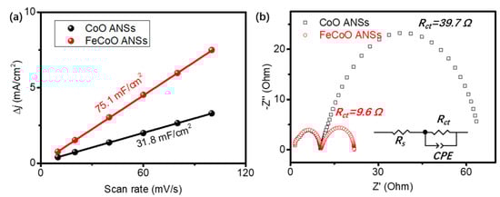The high valance Co ions are considered the active sites for OER at a high potential of 1.24 to 1.54 V vs. RHE (Co3+ and Co4+) [47]. The intrinsic activity of Co-based materials is usually determined by the Co3+ and Co4+ formation during OER. The abundant low bonded oxygen can promote the high Co cations formation; Refs. [48,49] meanwhile lead to the formation of delocalized electrons in Co, and thus promote the adsorption efficiency of water molecules on Co cations and enhance conductively and catalytic activity [50,51,52]. Furthermore, the low bonded O in CoOx ANSs can be regarded as pre-activated O2− or O0, which can be preferentially oxidized or released during OER and thus promote the OER [53]. These appearances are demonstrated by the fact that low bonded O-rich CoOx ANSs have higher OER activity than Co3O4 NSs (Figures S5 and S6). Moreover, the Fe can promote the OER activity of Co by decreasing the intermediate formation energy [54], the adsorption energy of OH−, and the desorption efficiency of O during OER [55]. This feature can lead to an ECSA value increase [46]. Figure 4a shows that Fe1Co1Ox ANSs possess the ECSA value of ca. 75.1 mF/cm2, which is 2-fold of CoOx ANSs (ca. 31.8 mF/cm2). Moreover, the changed electronic state on Co also can promote the conductivity, which shows an impact on efficacious charge transfer between support and catalysts [1,48]. The charge transfer resistance (Rct) is analyzed by electrochemical impedance spectrum (EIS) (measured at 1.53 V vs. RHE), as shown in Figure 4b. The Rct of Fe1Co1Ox ANSs is ca. 9.6 Ω, which is smaller than 39.7 Ω of CoOx ANSs, suggesting an accelerated charge transfer coefficient between FeCoOx ANSs and support. Indeed, the outstanding OER activity of FeCoOx ANSs may originate from the abundant low bonded O, intrinsic activity of Co, which is highly activated by Fe3+.